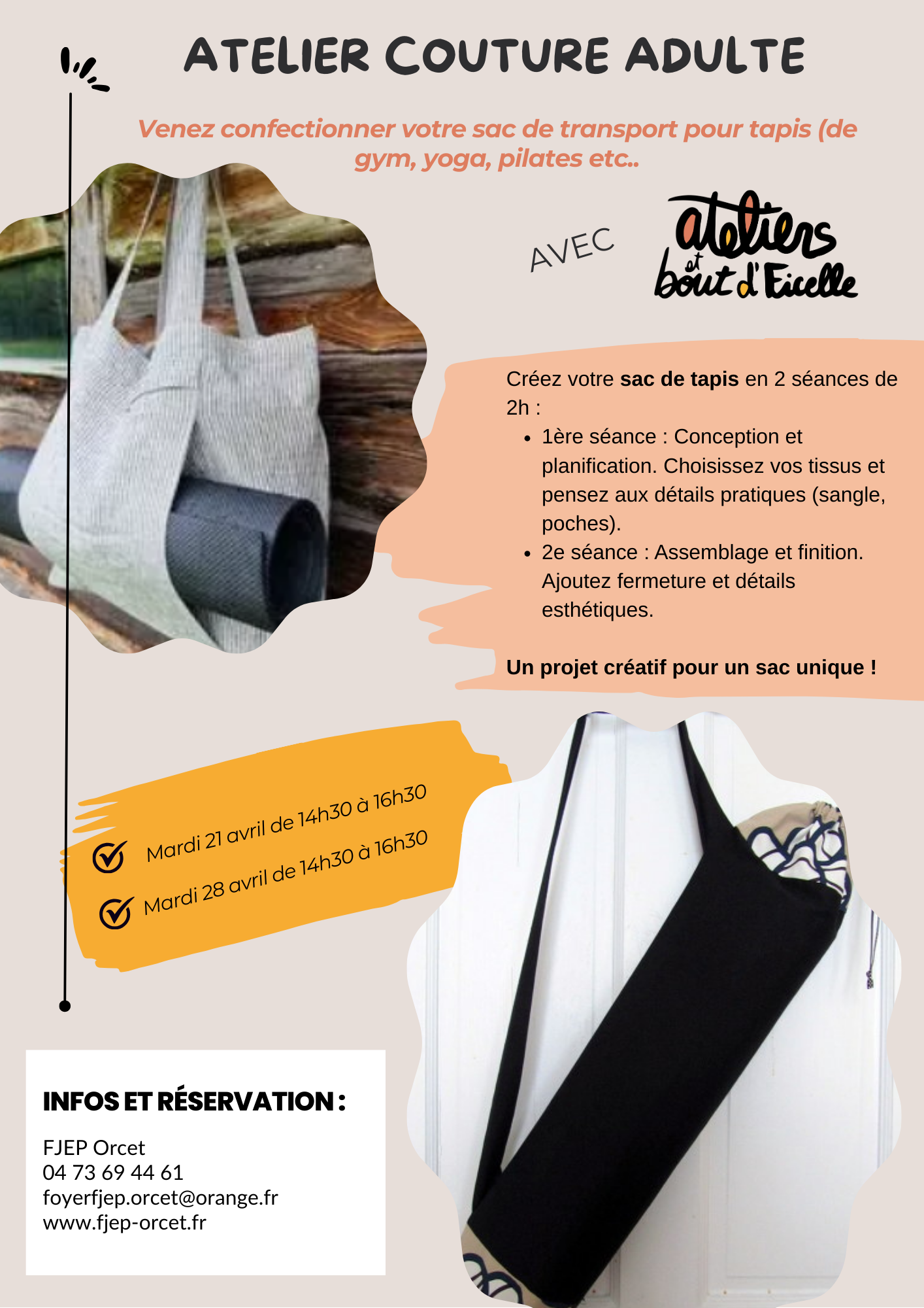 - Atelier adulte “Kit transport de tapis de yoga” – Mardi 21 avril et Mardi 28 avril – De 14h30 à 16h30 – 4 adultes